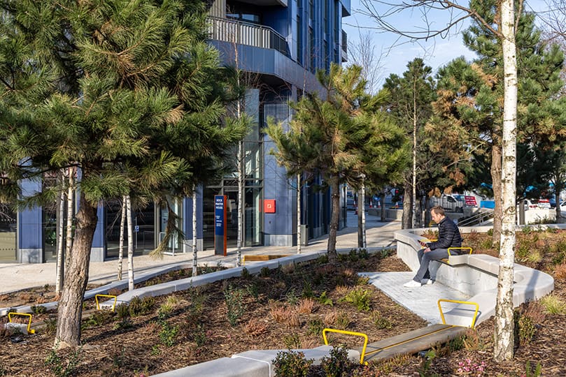 The park provides both a walking and cycling link between the Lower Lea Valley and the Limmo Peninsula Ecological Park just across the River Lea. Trees and landscaping surround the buildings at Cerulean Quarter which features;