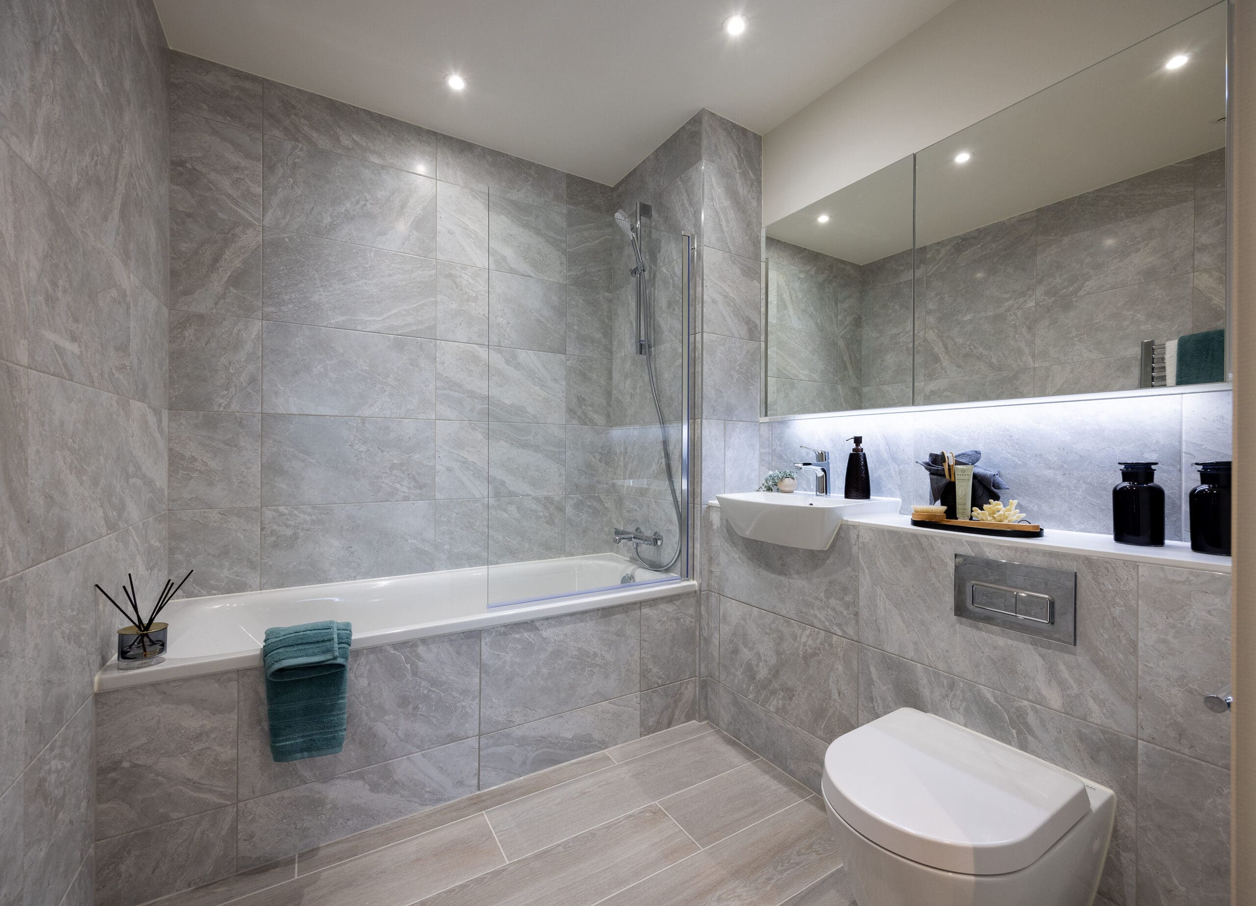 - Full height Porcelanosa tiling around bath and from floor to underside of the engineered stone vanity shelf