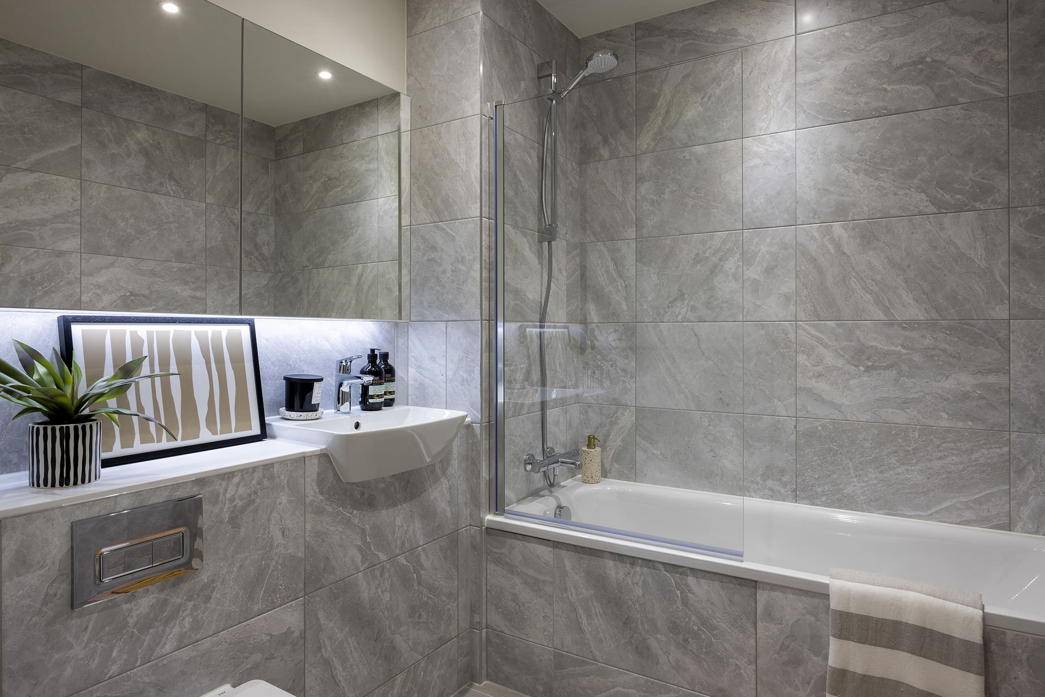 - Full height Porcelanosa tiling around bath and from floor to underside of the engineered stone vanity shelf